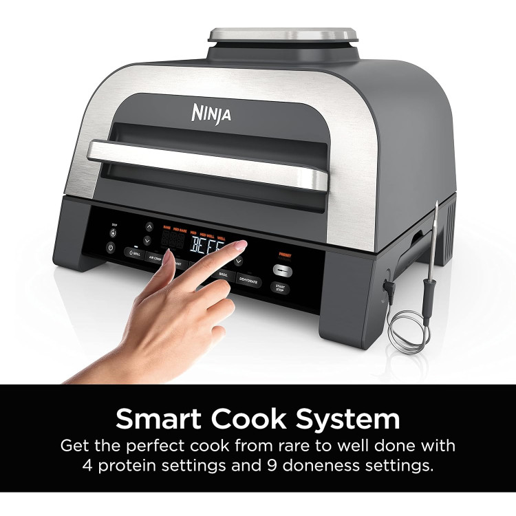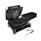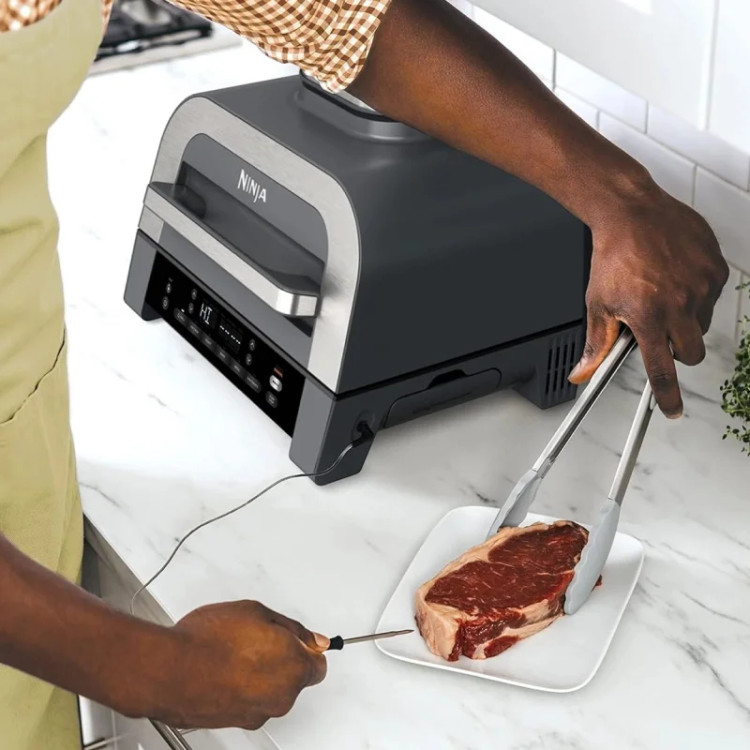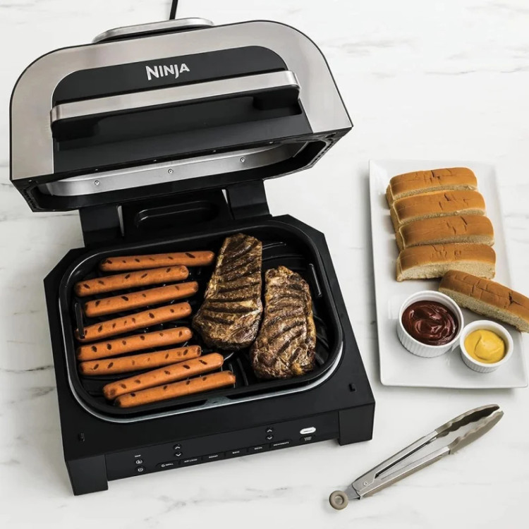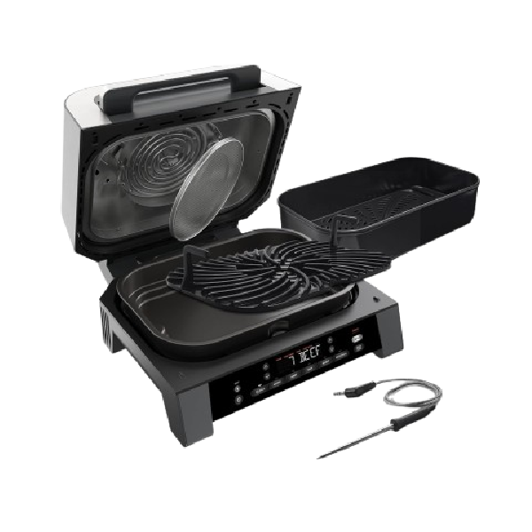گریل نینجا مدل DG551 با طراحی زیبا و منحصر به فرد به رنگ استیل/خاکستری جلوه مدرنی به دکوراسیون آشپزخانه شما می بخشد. این دستگاه از نوع رومیزی و جمع و جور بوده که روی پیشخوان یا میز آشپزخانه فضای زیادی را اشغال نمی کند. صفحات این گریل از ظرفیت خوبی برای طبخ مواد غذایی برخوردار بوده و تا 6 استیک، حداکثر 24 هات داگ را می توان همزمان آماده کرد. همچنین در سینی پخت دستگاه می توان حجم زیادی سیب زمینی خلالی، قارچ خرد شده و غیره را سریع درست کرد.