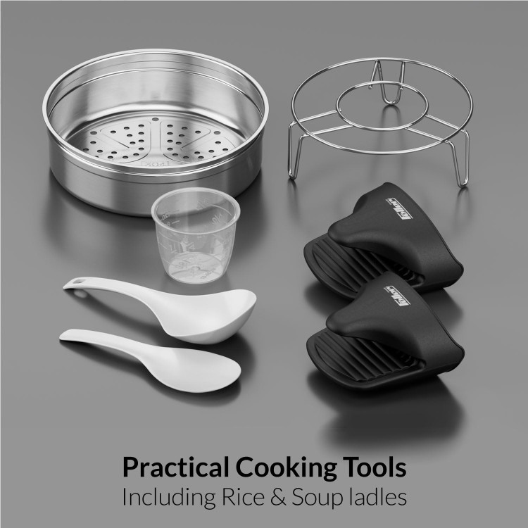 ◾اقلام همراه، سبد بخارپز استیل و رک بخارپز، قاشق برنج، پیمانه و دستکش