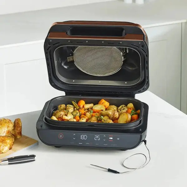 کبابپز Ninja Foodi Smart XL که چیپسها را سرخ میکند، میپزد و با تکنولوژی هواپز طبخ میکند. نسل دوم با طراحی شیک جدید با سیستم آشپزی هوشمند و ظرفیت XL، به وعدههای غذایی پرجمعیت خانواده با فشار دادن یک دکمه به پخت کامل، از rare تاwell done، دست پیدا کنید. گریل NINJA FOODI SMART با عملکرد ۶ در ۱ شامل:۶ عملکرد پخت و پز همه کاره ازجمله Grill, Air Crisp, Roast, Bake, Broil, and Dehydrate با طیف وسیع دما فعال شده است.از دیگر ویژگی های جذاب این دستگاه که آنرا تبدیل به یک انتخاب مناسب برای کسانی که وقت زیادی ندارند کرده ویژگی تمیز کردن آسان آن است صفحه گریل با روکش سرامیکی، قابل جدا شدن، سبد و قابلمه پخت و پز همگی قابل شستشو در ماشین ظرفشویی هستند و به راحتی تمیز می شوند. کباب پز با ظرفیت بالا که دقیقاً با نتایج عالی پخت می شود بیش از یک گریل –با ۶ عملکرد پخت: سرخ کردن با هوا، پختن، برشته کردن، گرم کردن مجدد، آبگیری و گریل کردن سیستم آشپزی هوشمند - کاوشگر پخت دیجیتالی به شما امکان میدهد بدانید چه زمانی غذای شما کاملاً پخته شده است، دقیقاً همانطور که دوست دارید، غذای سرخ شده تا ۷۵ درصد چربی کمتر نسبت به روش های سرخ کردنی سنتی می باشد ، شامل قابلمه ۳.۸ لیتری، سبد کری سپر ۳.۸ لیتری، بشقاب گریل ۷۴۰ سانتی متری مربعی، برس تمیزکننده، راهنمای دستور پخت آشپز است. قطعات قابل شستشو در ماشین ظرفشویی سیستم آشپز هوشمند کاوشگر پخت دیجیتال دقیقاً دمای غذای شما را در حین پخت نظارت می کند، بنابراین نیازی به این کار ندارید! از موارد کمیاب تا خوب انجام شده، پایان خود را انتخاب کنید و گوشت و ماهی مورد علاقه خود را با کاوشگر در جای خود بپزید. هشدارهای صوتی به شما اطلاع میدهند که چه زمانی آماده برداشتن و استراحت قبل از ارائه است. بیشتر از یک گریل با ۶ کارکرد پخت و پز - سرخ کردنی در هوا، پختن، برشته کردن، آبگیری، گرم کردن و گریل کردن، غذاها و میان وعده های خوشمزه را برای کل خانواده ایجاد کنید. بدون نیاز به تلنگر با فناوری Cyclonic Air. از یخ زده بپزید. بشقاب گریل بزرگ ۷۴۰ سانتی متر مربعی تا ۶ همبرگر مناسب است. شامل قابلمه ۳.۸ لیتری و سبد کریسپر ۳.۸ لیتری. قابلیت میوه خشکن کن، سرخ کن ، گریل کردن و پخت و پز را دارد ، طول سیم ۹۰ سانتی متر ، بدنه ضدزنگ ، ولتاژ ۱۲۰ ولت ، آمپر ۶۰ آمپر ، توان ۱۷۶۰ وات ، قابل شستشو در ماشین ظرفشویی را دارد .