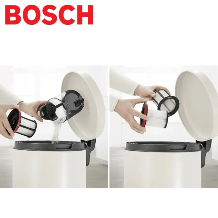 این نوع جاروشارژی بوش مجهز به سیستم Easy Clean است. این سیستم به جدا کردن آلودگیها از برس و شیلنگ و تمیز کردن راحتتر آنها کمک میکند. مکش این جارو از نوع توربو بوده و همچنین مخزن زباله آن قابلیت جدا شدن و شستشو را دارد. نکته دیگری که در مورد مخزن این جارو باید به آن اشاره کنیم، ظرفیت بالای آن است. ظرفیت این مخزن ۳۰۰ میلیمتر و جنس بدنه آن نیز شفاف است. این شفافیت کمک میکند که به راحتی بتوانید از پر یا خالی بودن آن مطمئن شوید.